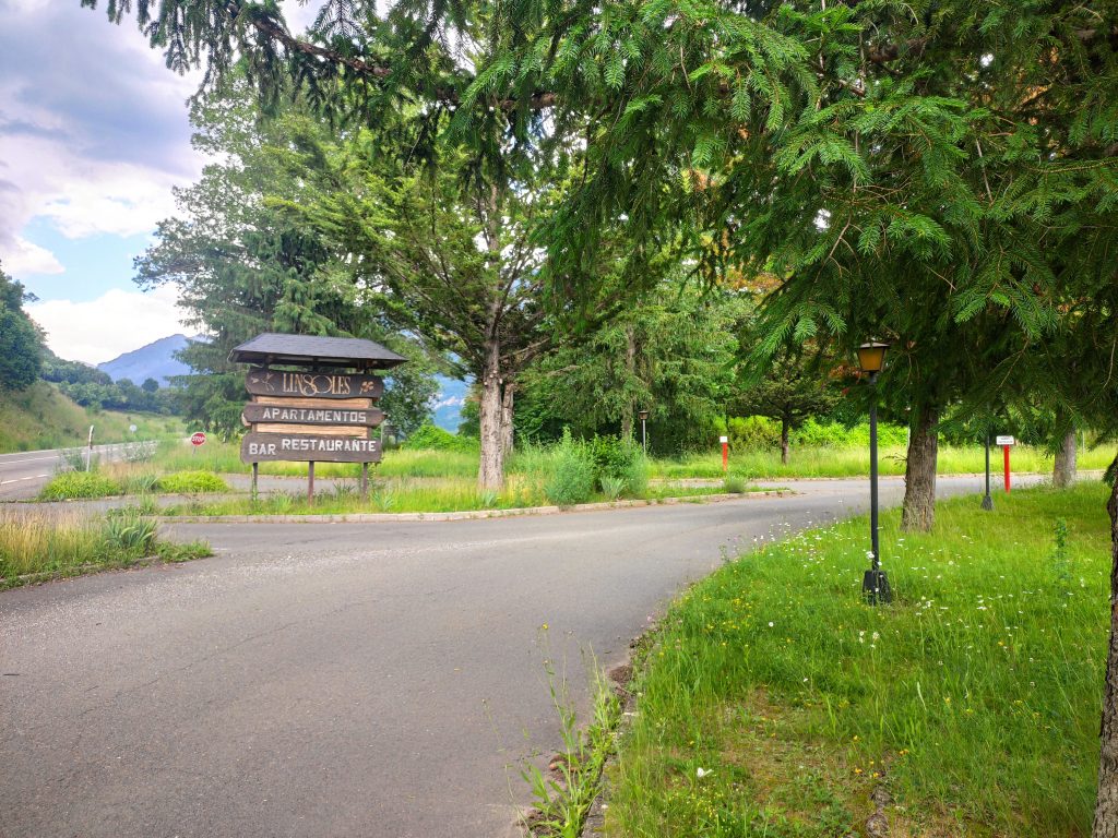 Once you reach the town of Eriste and pass the Hotel Eriste, there is an entrance on the right where there is a large wooden sign that say